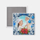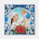 Lägg till ett eget foto till detta vackra blåa julfoto ram med en röd och grönt poinsettia, blå och silver julprydnad och en dekorativ lacy white blommigt-design på blå bakgrund.