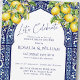 Denna citroninspirerade bröllopsduschinbjudan har färska akvarellillustrationer av citroner och ömtåliga citronglommor, tillsammans med ett medelhavsinspirerat kakelmönster arrangerat i en mjukt välvd form för en elegant och soldränkt look. Rubriken ”Låt oss fira” tillför en glad och inbjudande touch.