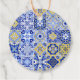 Medelhavsinspirerad design med ljusa blå och gula italienska Amalfi-kuststilsplattor med akvarellmålade citroner och falskt guld glitter cirkelram.