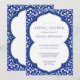 Denna eleganta bröllopsfestinbjudan visar upp en slående blå och vit medelhavsinspirerad kakeldesign, infattad i en graciös välvd form som ger en tidlös och sofistikerad touch. Det intrikata mönstret frammanar klassisk kustcharm, medan den rena typografin håller layouten raffinerad och lätt att läsa.