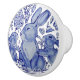I min kaka i blått och vitt finns en kaninfamilj - en mamma och två kakor - i en stiliserad skogsmiljö med blommor, löv och bär.Kaninen på den här knoppen ansikte lämnat. En underbar hemdekanal eller ett hantverksmässigt accent! Det påminner om det antika Delft-potteriet men med ett modernt utseende.Säljs endast av Zazzle, med dess hundraprocentiga kundgaranti. Nyskapande, unika teckningar och design av Tuzi Williams.