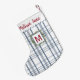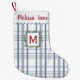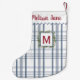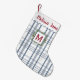 Välkommen in till julen med denna anpassningsbara julstrumpa som har ett klassiskt blått och vitt karomönster, en trendig bågig kant, en festlig julgranskrans och elegant typsnitt. Lägg till namn och initial för att skapa en personlig gåva till familj eller vänner som säkert kommer att bli en älskad del av deras jultraditioner.