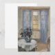 Stue Med Lyseblå Gardiner og Blå Clematis, vardagsrum med ljusblå gardiner och blå Klematis (1913) av Anna Ancher är en vintage-impressionistisk konstmålning. Genomskinliga blå gardiner hänger för fönstret med varmt sommarljus som strömmar in. En klematisväxt från trädgården står på ett bord i konstnärens ateljé.