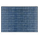 En medelblå färg, med en korktextur av slumpmässigt placerade små svarta hål, utgör bakgrunden till det ursprungliga konstverket av HomeWare på denna 11”x8” skärbräda. Över denna bakgrund finns horisontella ränder som består av tre tunna vita linjer vardera. I mitten är dessa ränder vågiga, i ett rippelat mönster som rätas ut när det närmar sig kanterna.