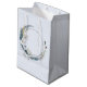 Giftväska med en mystisk illustration. Ett mörk blått halvmånsfärdigt måne med en elegant tunn cirkelkontur och vita blommans blommar längs kant.
