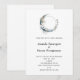 En bröllopsinbjudan med en mystisk illustration. Ett mörk blått halvmånsfärdigt måne med en elegant tunn cirkelkontur och vita blommans blommar längs kant.