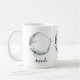 Ett mugg med en mystisk illustration. Ett mörk blått halvmånsfärdigt måne med en elegant tunn cirkelkontur och vita blommans blommar längs kant.