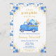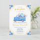Den här söta och roligt vattenfärgsduschinbjudan för spädbarn har en blå fullt lastbil av pumpor, blomsterarrangemang och guld konetti. Texten kombinerar handskript och sans serif typsnitt för en snyggt och ett modernt utseende. Det här är perfekt för en höstbarnsköljning. Grafik efter www.etsy.com/uk/shop/SunflowerDayLove
