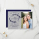 Det här vackra bröllop spara datum-kortet har en rustik marin blått och grått-design med moderna manusbokstäver och en sprit av handmålade vattenfärgade löv, vindruvor eller bladverk. Det finns plats för ditt foto, parets placering i namn & bröllop. Elegant, snyggt och chic, det här kortet är ett underbart sätt att låta dina vänner och familj veta att spara datumet för din speciella dag.