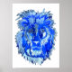 en dekorativ design av ett lejont huvud av hankön i surrealistiskt blått färg som dekorativ ^poster utskrift. en stor blått hårig-katt.