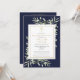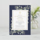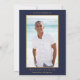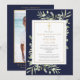 En elegant personlig inbjudan till minneshögtid med fotografi med botaniskt akvarellgrönt lövverk på marinblå bakgrund. Designad av Thisisnotme©
