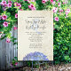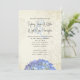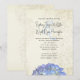 Blå hortensia-blomma bröllopsinbjudan mall. Skript och tryckta teckensnitt med namn hålls samman med ett stort "och"-tecken i ljusblått. En ljusblå blomma dekorerar botten av 5x7 tum papper, med många uppgraderingsalternativ. Bakgrunden är sepia-ton med illustrerade hortensia-blommor.