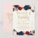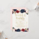 Blå, maroon och rosa brunch och bubblig bröllopsfest inbjudan med två blomsterarrangemang och ett högt champagneglas. Designen inkluderar också en falsk guld kalligrafi rubrik och en blek rosa akvarell tvätt på baksidan av inbjudan. Denna bröllopsfest inbjudan är idealisk för alla som söker en blå och maroon blomsterinbjudan.
