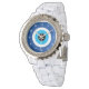 Blue Mati Evil Öga symbol vit emel klocka för kvinnor. Azure Blue Grekiska/Turkiska ikon för skydd och lycka till. Anpassningsbar dam vakta. Anpassa med text valfritt.