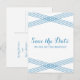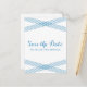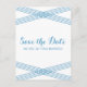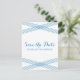 Enkel och elegant Modern Deco Spara datum vykort med ett randigt korsrutigt dekormönster i blått. Detta klassiska spara datum vykort kan enkelt anpassas med dina bröllopsdetaljer. För fler anpassningsalternativ, klicka på knappen Anpassa.