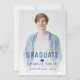 Moderna och minimala typografi examensmeddelanden med foto, rolig examensfest inbjudan på baksidan i blått och vitt, Anpassa det med ditt eget foto och festinformation.