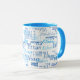 En coola blå mugg med mönster av namn med olika typsnitt stilar, för honom och för henne