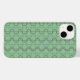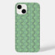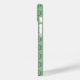 Den här telefonväskan har en konsthandledning av blå och lila halvcirklar som förbinder med linjer på en fält av ljust grönt.