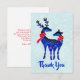 Ett festligt julklapp, tack för ditt kort - platt stil. En ljust grönt och vit snöbakgrund tittar. Illustrerad med ett par blå skandinaviska hjortar med röda halsdukar. Med dekorativa markeringar på kropparna.