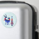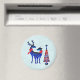 En magnet med en ljust grönt och vit snöbakgrund tittar. Illustrerad med ett par blå skandinaviska hjortar med röda halsdukar. Med dekorativa markeringar på kropparna. En nordisk Julgran i stil i blått och rött med en stjärna överst, står bredvid renarna.