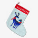 Personlig julstrumpor med ljust grönt och vit snöbakgrund tittar. Illustrerad med ett par blå skandinaviska hjortar med röda halsdukar. Med dekorativa markeringar på kropparna.