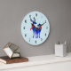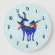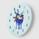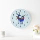 En klocka med ljust grönt och vit snöbakgrund tittar. Illustrerad med ett par blå skandinaviska hjortar med röda halsdukar. Med dekorativa markeringar på kropparna.