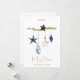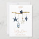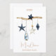 Vit bakgrund, brunt trä och blå och vit juldekoration. Blå och vita stjärnor och en blå gnomkvinna. God jul skrivet med ett stil-skript som hanteras med trendig. Tillbaka: lägg till ditt meddelande och din logotyp.