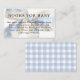 Ett sött "böcker för bebis"-följekort att lägga till dina baby shower-inbjudningar. Varje gäst tar med en bok till bebisen till showern istället för ett kort. Boken kan vara ny eller varsamt använd, vilket gör en fin start på att bygga ett litet bibliotek för bebisen. Denna eleganta design har en pastellblå och elfenbensvit båge som lutar åt ena sidan med ett matchande gingham-rutmönster på baksidan.