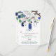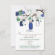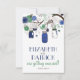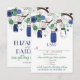 Whimsical illustrationer av marinblå murarburkar som hänger i ett träd med hjärtsnören, två älskande och en mängd blå och gröna blommor. Denna bröllopsinbjudan har matchande artiklar. Denna murarburksinbjudan skulle vara perfekt för en vår-, vinter- och utomhusbröllop.