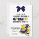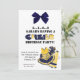Söt födelsedagsinbjudan för den lilla flickan som gillar cheerleading. Den har en blå och gul cheerledardräkt, pom-pom och en megafon i det nedre högra hörnet. En grafisk bild av en blå slinga hänger från toppen. Du anpassar texten.