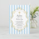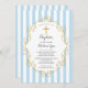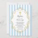Dop inbjudan med en blå och vit randig bakgrund med ett guld kors och ram för en pojkes dop