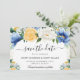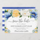 Vacker akvarell blå och gula sommarblommor blomsterdesign med guld glitterkonfetti och randigt mönster i bakgrunden