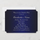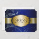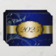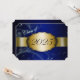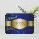 Inbjudan till blå och guld examensfest med ljusa och mörka blå blommor och ett gyllene band som löper tvärs över och visar examensåret. Baksidan av kortet är blå med ljusgyllene typsnitt för att människor ska fylla i examensfestens tillkännagivanden.