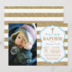 Blå och guld glitter dop inbjudan med eget foto. Pojke dop. Första kommunion. Dop. Barn dedikation. Guld och vita ränder. För ytterligare anpassning, klicka på "Anpassa" knappen och använd vårt designverktyg för att ändra denna mall.