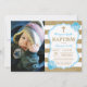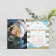 Blå och guld glitter dop inbjudan med anpassad bild. Pojke dop. Första kommunion. Dop. Barn dedikation. Guld och vita ränder. Blå blomma. För ytterligare anpassning, klicka på "Anpassa" knappen och använd vårt designverktyg för att ändra denna mall.