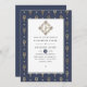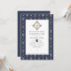 Nautisk bröllopsinbjudan med en pärla som är märkt med diamanter faux guld foil trident mönster mot en marin blå pärlbakgrund.