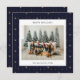 Juldkort med en blå och guldrandig tapetbakgrund med ett familjefoto i kombination med en högtidlig hälsning och ditt namn och år i en sans serif-teckensnitt.