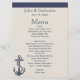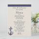 Nautisk temad bröllop-menyer i elfenben, med marinblå accenter och vintage av en frakts ankare, på lämnat sida. Anpassa den blå texten till bröllop firande. Matchande produkter är tillgängliga.
