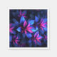 Bilden innehåller två närliggande blommor i blå och lila mot mörkens bakgrund. Blomman på den lämnat är en violett med fem blå blad och en gult. Blomman på högerna är lätt lila med fem vågigt petaler. Båda blommorna har grönt löv.