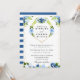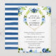 Den här romantiska bröllopsinbjudan har en vackert arrangerad hjärtformad krans av blå och marinblå blommor med mjuka gröna inslag. Den blomsterprydda ramen skapar en slående fokuspunkt runt evenemangets detaljer och blandar modern akvarellstil med tidlös botanisk elegans. En subtil randig accent ger en fräsch, modern touch, medan den svala färgpaletten inger lugn, sofistikering och förfinad feststämning. Perfekt för klassiska, trädgårds-, kust- eller moderna bröllop som söker en graciös blomsteraestetik.