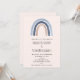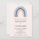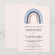 En bröllopsinbjudan med en söt och fantasifull regnbåge. Blå och persikofärgade färger.