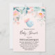 Babyduschinbjudningar med en söt bild av ett ljusblått baby flaska med rosa fälg. En rosa och grönt blommigt gräns lägger till en aning feminitet.