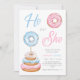 En söt donut: inbjudan till Baby Gender Reveal-part. Den blå och rosa typografin lyder "Han eller hon", på en vit bakgrund med vattenfärgade munkar.