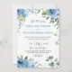 Vackra blommigtar, botaniska bröllopsinbjudningar i dammig blått och sage grönt med typografin stil text som är fullt redigerbar är både elegant och fullt av gammaldags romantik. Vattenblommor med eukalyptus och blått ro, tillsammans med en mängd olika blommor i trädgårdsodling och vild och grönenergi fyller kant på denna vackra och unika blåbröllopsinbjudan.