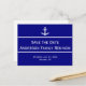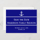 Denna vita och marinblåa familjeåterförenings inbjudan har ett vitt båtankare högst upp. I mitten mellan två rader finns anpassningsbar text som för närvarande lyder 'Spara datum Andersson Familjeåterförening'. Anpassa din inbjudan med familjens namn, återförening och plats för återföreningen.