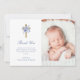 De här elegant-Franskarna, stil Baptism eller Christening-tack du-korten, har ett vackert chinoiserie mönster av blå vattenfärgblommor och botaniskt löv på baksidan. Modern kalligrafi och klassisk text visas på framsidan, med en enkel vit bakgrund. Blommorna är en blandning av dammblått och marint blått, och det finns en faux guld kor och en bild av baby. De här tackkorten är också perfekt för alla andra kristna religiösa firande, som First Heliga Communion eller Confirmation.