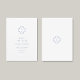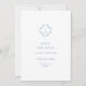Chic med ungdomlig elegans. Det här dammiga blå och vita platta bröllop spara datum-kortet utstrålar en ny, modern och ungdomlig ton. Kortets framsida innehåller en contemporary av typsnitt i dammigt blått och elegant blommigt par monogram, mot en skarp vit bakgrund. Baksidan bär ett par blommigtar monogram.