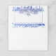 Det här platskortet för te party har en monokromatisk utformning med en blå och vit teuppsättning omgiven av blommor.