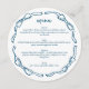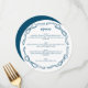 En rolig detalj för en bröllops- eller baby shower, bröllopsfest eller tjejkväll, denna runda middagsmeny har en cirkelformad krans av handritade band och slingor i klassisk marinblå och vit. Anpassa menyn med dina egna maträtter och redigera teckensnittsval, mellanrum och alla färger med hjälp av den blå knappen "Redigera design" för att verkligen anpassa den för din händelse.