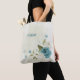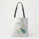 Vacker romantisk totebag med blå och vita blommor och några fina gröna blad .